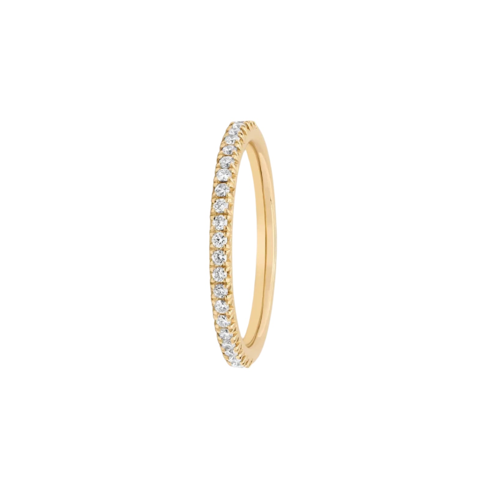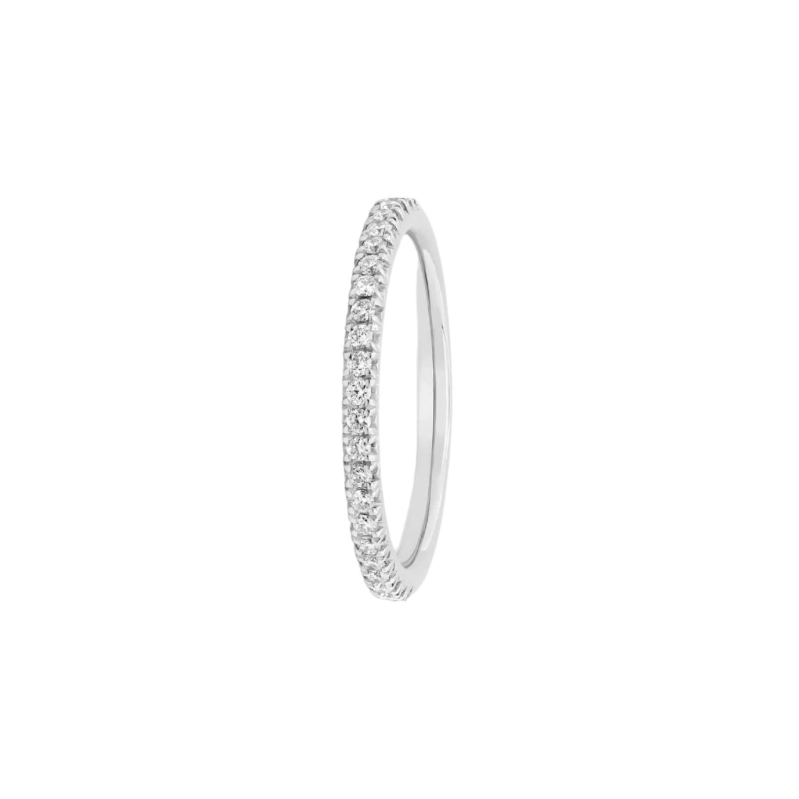 Exuding brilliance and elegance, this French pave diamond wedding ring is expertly crafted to amplify each diamond’s sparkle. The unique setting ensures maximum light reflection from all angles, creating a dazzling display of luminosity that will captivate forever.