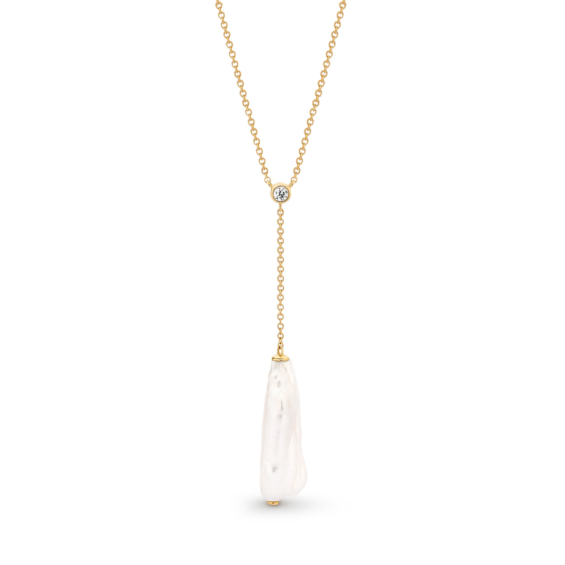 9ct yg 15-20mm long wht baroque FWP white topaz pendant with chain