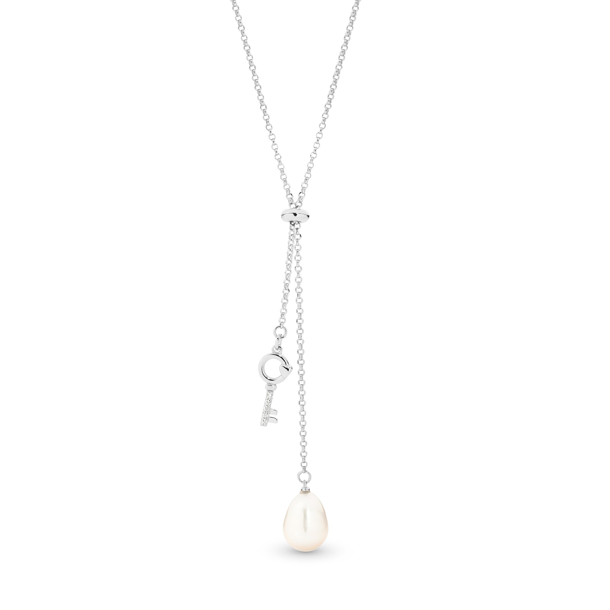 S/S white 9-10mm FWP cz key charm 41cm n'lace + 5cm ext.